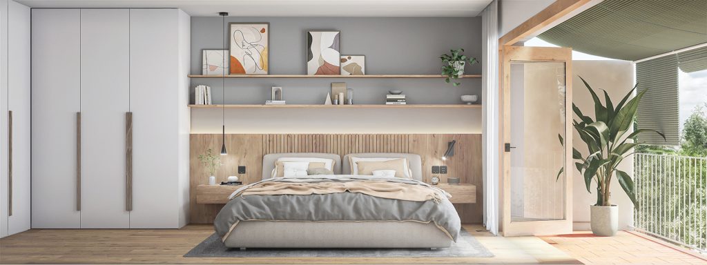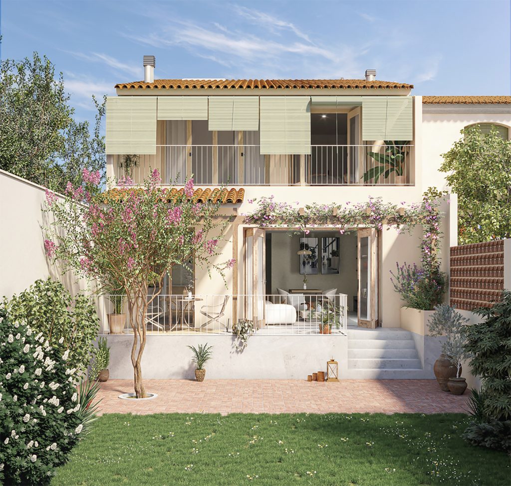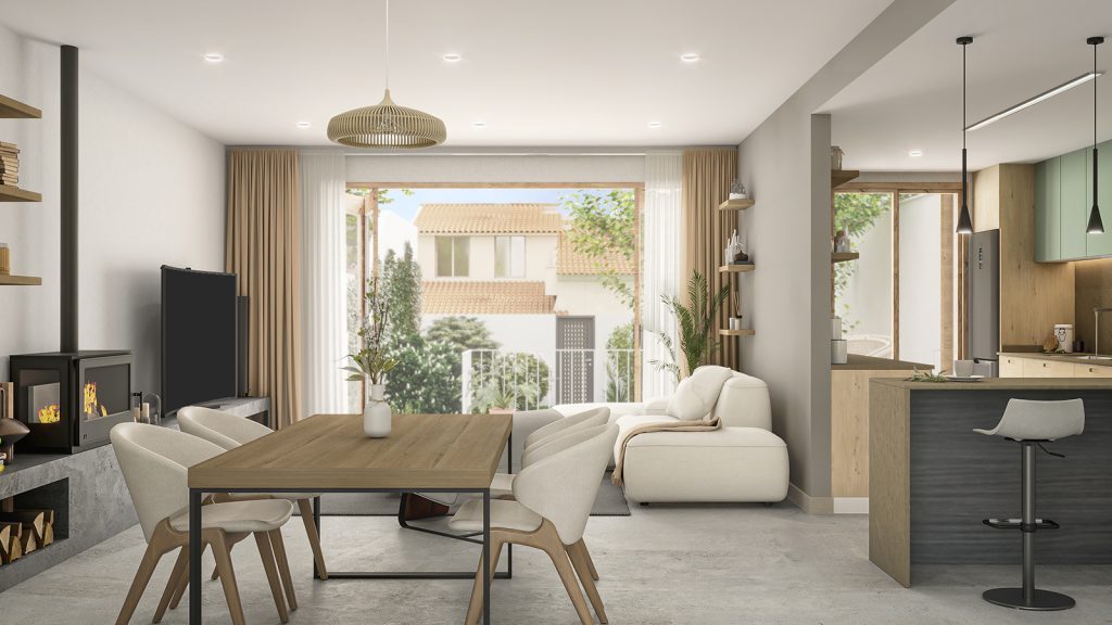 El elemento protagonista es el patio posterior, conectado con la zona de día mediante grandes aperturas que refuerzan la relación interior–exterior. Este espacio se organiza en un porche con pérgola y una zona de patio abierto.